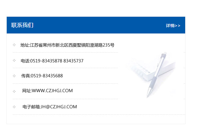 地址:常州市新北區友邦商務大廈1幢16、17層  電話:0519-85101652  傳真:0519-85112595  郵編:213022  網址:www_cz-jiayue_cn.jingjieshengwu.com  郵箱:xiajifengaa@163.com